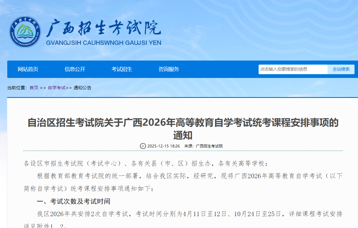 根据教育部教育考试院的统一部署,结合我区实际,经研究,现将广西2026年高等教育自学考试(以下简称自学考试)统考课程安排事项通知如下: