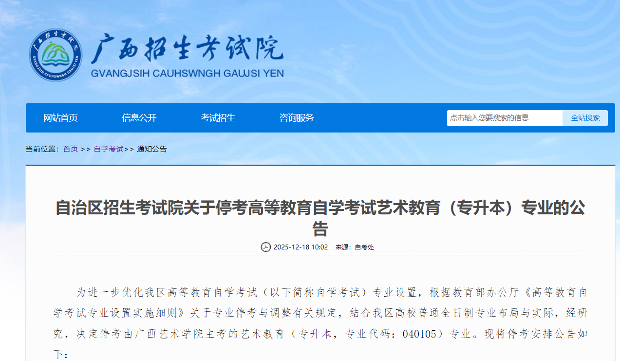 为进一步优化我区高等教育自学考试(以下简称自学考试)专业设置,根据教育部办公厅《高等教育自学考试专业设置实施细则》关于专业停考与调整有关规定,结合我区高校普通全日制专业布局与实际,经研究,决定停考由广西艺术学院主考的艺术教育(专升本,专业代码:040105)专业。现将停考安排公告如下: